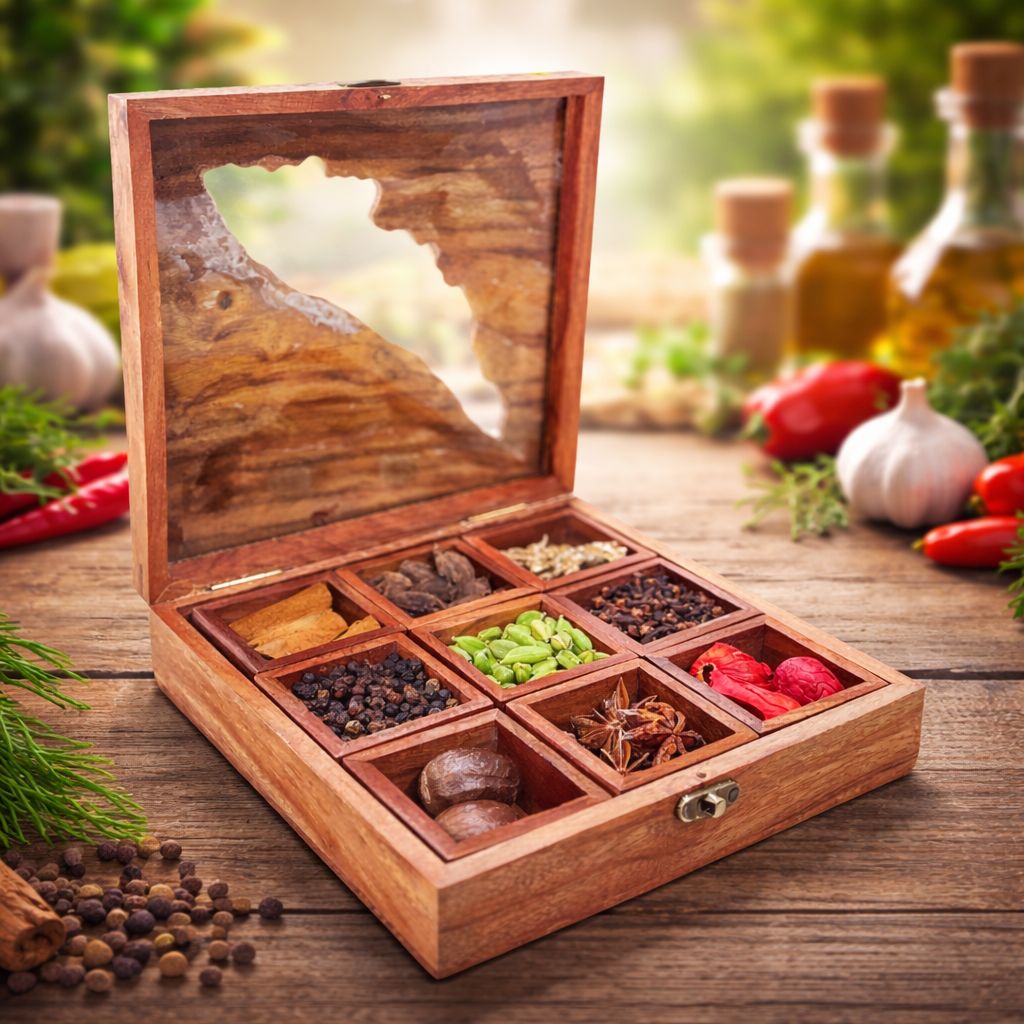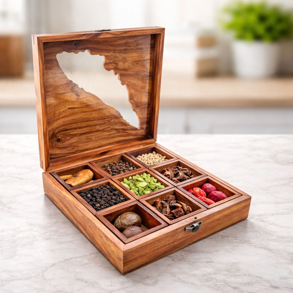 Kerala Wooden Spices Gift Box – Kerala Map Curved Design (9 Premium Spices with Glass Lid)